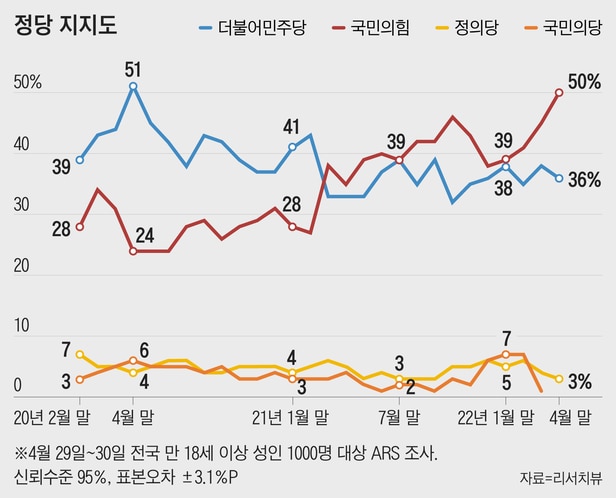 국힘 50% vs 민주 36% 한달새 격차 14%p로 벌어져 [리서치뷰] 국민의힘 지지율 50%는 리서치뷰가 RDD 방식의 월례조사를 시작한 2011년 5월 이후 11년 만에 최고치