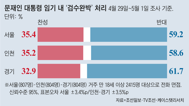 검수완박, 文 임기 내 처리 반대 60.4% 국민투표 찬성 62.1% 조선일보·TV조선 수도권 여론조사 정당 지지율도 역풍 국민의힘 44.8% 민주당 36.9% 서울·인천시장·경기지사 후보