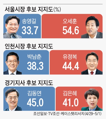 조선일보·TV조선이 케이스탯리서치에 의뢰해 실시한 지방선거 여론조사는 4월 29일~5월 1일 서울(807명)·인천(804명)·경기(804명)에 거주하는 만 18세 이상 2415명을 대상으로 실시했다. 각 문항의 수도권 지역 평균치 분석은 서울·인천·경기 3개 지역 사례수 2415명을 지역별 인구 분포로 재가중한 결과다.