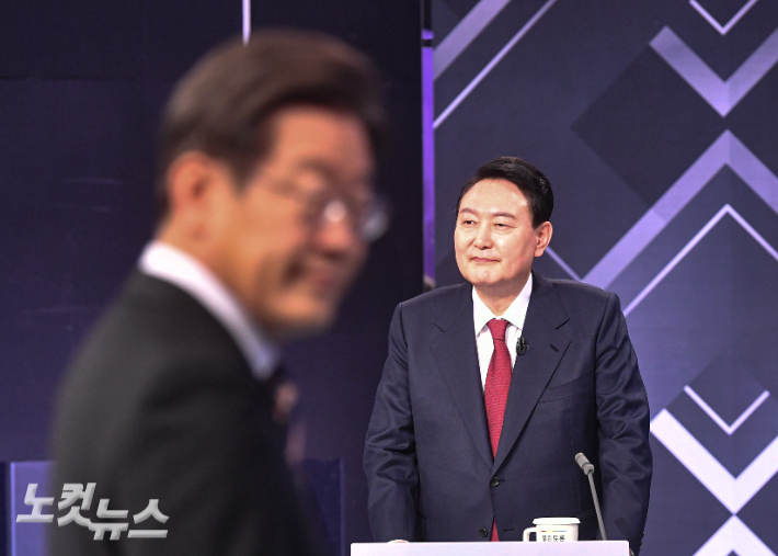 윤석열 국민의힘 대선후보가 미소를 짓고 있다. 왼쪽은 이재명 더불어민주당 후보. 윤창원 기자