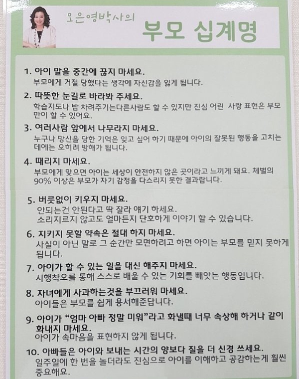 ◆ 오은영> 사실 이 계명이라는 것은, 여기 보시면 1부터 10까지 있는 게요. 늘 우리가 많이 생각하는 것들이에요. 그러니까 제가 만들기는 했지만 우리가 그냥 중요하다고 생각하는 것을 제가 모아서 정리해 놓은 것에 불과합니다. 그런데 보면 이거 다 지킬 수 있을까? 그런데 언제나 육아는 완벽을 추구하는 것이 아니라 방향성을 가지고 그렇게 언제나 노력을 하는 거니까요.