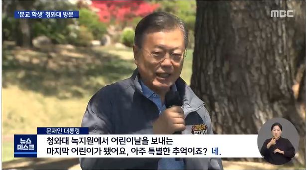 문재인 대통령이 5일 청와대 녹지원에서 만난 어린이들에게 "녹지원에서 어린이날을 보내는 마지막 어린이가 됐다"고 말하고 있다. 실제로는 10일부터 하루 3만여명씩 신청자 누구나 녹지원에서 놀 수 있다. 그럼에도 이러한 발언은 아무런 여과없이 방송을 통해 자막까지 더해져 국민들에게 전달됐다. /MBC 방송 화면 캡처