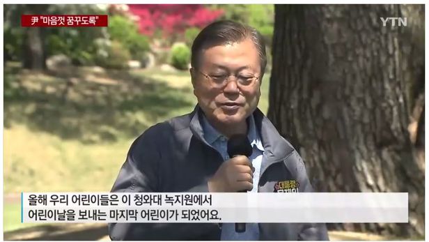 문재인 대통령이 5일 청와대 녹지원에서 만난 어린이들에게 "녹지원에서 어린이날을 보내는 마지막 어린이가 됐다"고 말하고 있다. 실제로는 10일부터 하루 3만여명씩 신청자 누구나 녹지원에서 놀 수 있다. 그럼에도 이러한 발언은 아무런 여과없이 방송을 통해 자막까지 더해져 국민들에게 전달됐다. /YTN화면 캡처