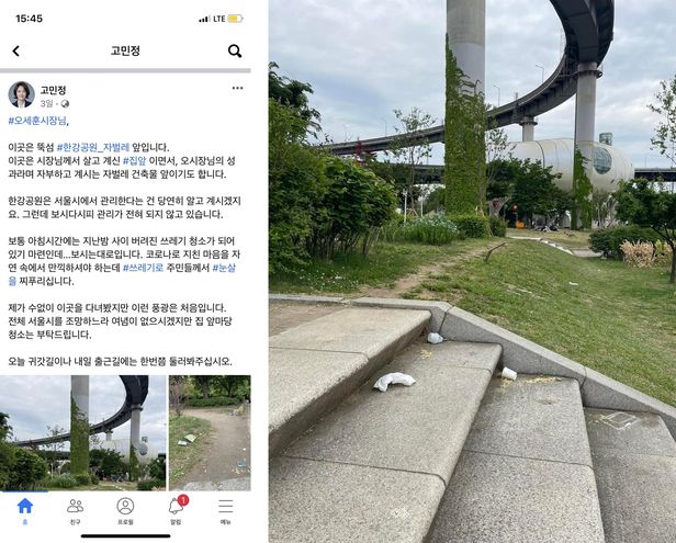 고민정 더불어민주당 의원은 지난 8일 자신의 소셜미디어에 뚝섬한강공원 일대에 버려진 쓰레기 사진을 올리며 “관리가 되고 있지 않다고 주장했다. 그러나 이를 접한 뚝섬한강공원 미화원들은 “새벽 7시부터 밤 10시까지 쉴새 없이 치우고 있는데도 쓰레기가 쌓이고 있는 게 한강 공원의 현실”이라며 “관리 문제를 지적한 것에 대해 아쉽게 생각한다”고 밝혔다.