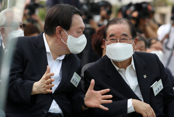 2021년 6월 9일 윤석열 전 검찰총장이 서울 중구 남산예장공원 개장식에서 죽마고우의 아버지인 이종찬 국립대한민국임시정부기념관 건립위원장과 대화하고 있다. © News1