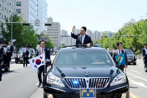 윤석열 대통령이 10일 서울 여의도 국회 앞마당에서 열린 제20대 대통령 취임식을 마친 후 카퍼레이드를 하고 있다. (대통령실 제공) © News1