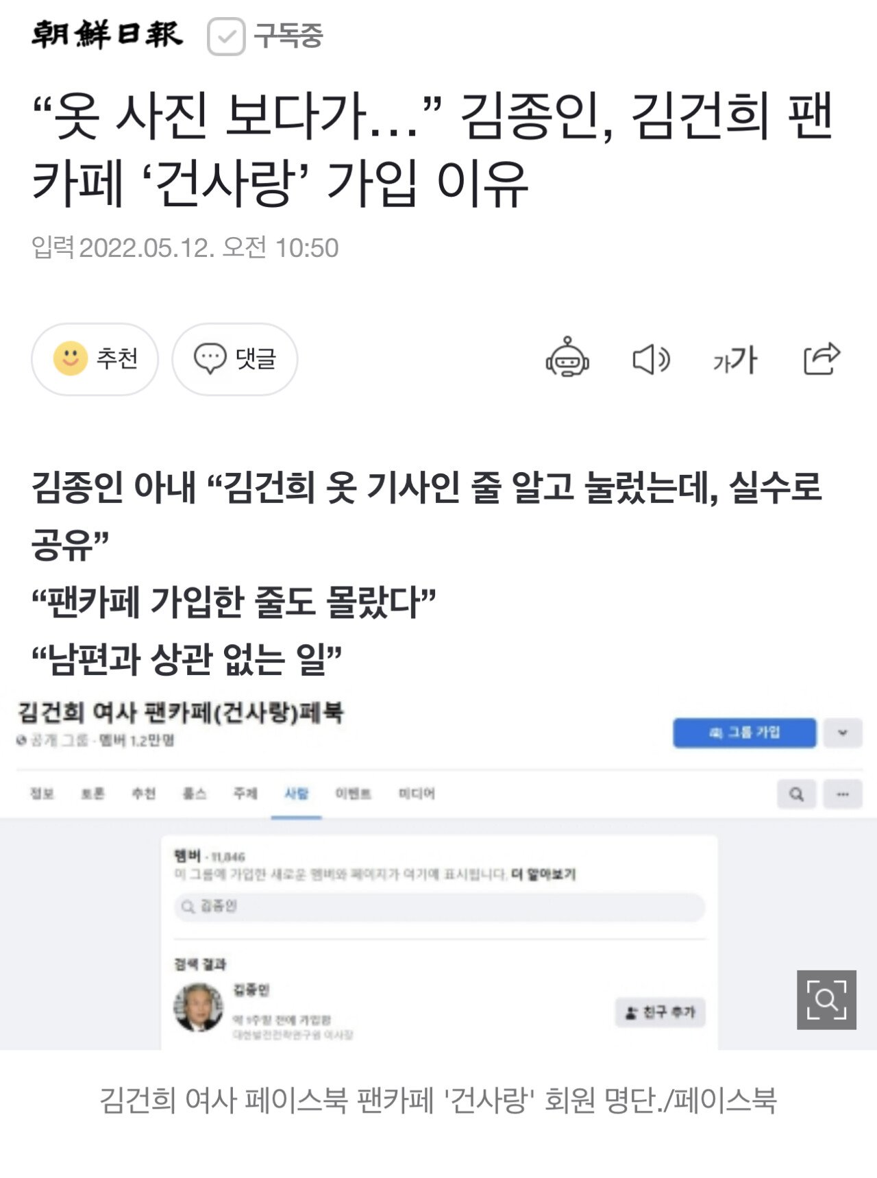 기사 삭제되는 이유는 뭘까? 김종인, 김건희 팬카페 '건사랑' 가입 이유 김종인 아내 김건희 옷 기사인 줄 알고 눌렀는데 실수로 공유 팬카페 가입한 줄도 몰랐다 남편과 상관없는 일