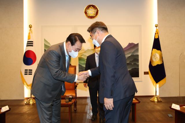 윤석열 대통령이 16일 국회에서 열린 추가경정예산(추경)안 시정연설을 앞두고 박병석 국회의장, 여야 지도부와 환담에 앞서 윤호중 더불어민주당 공동비상대책위원장과 악수하고 있다. 대통령실사진기자단
