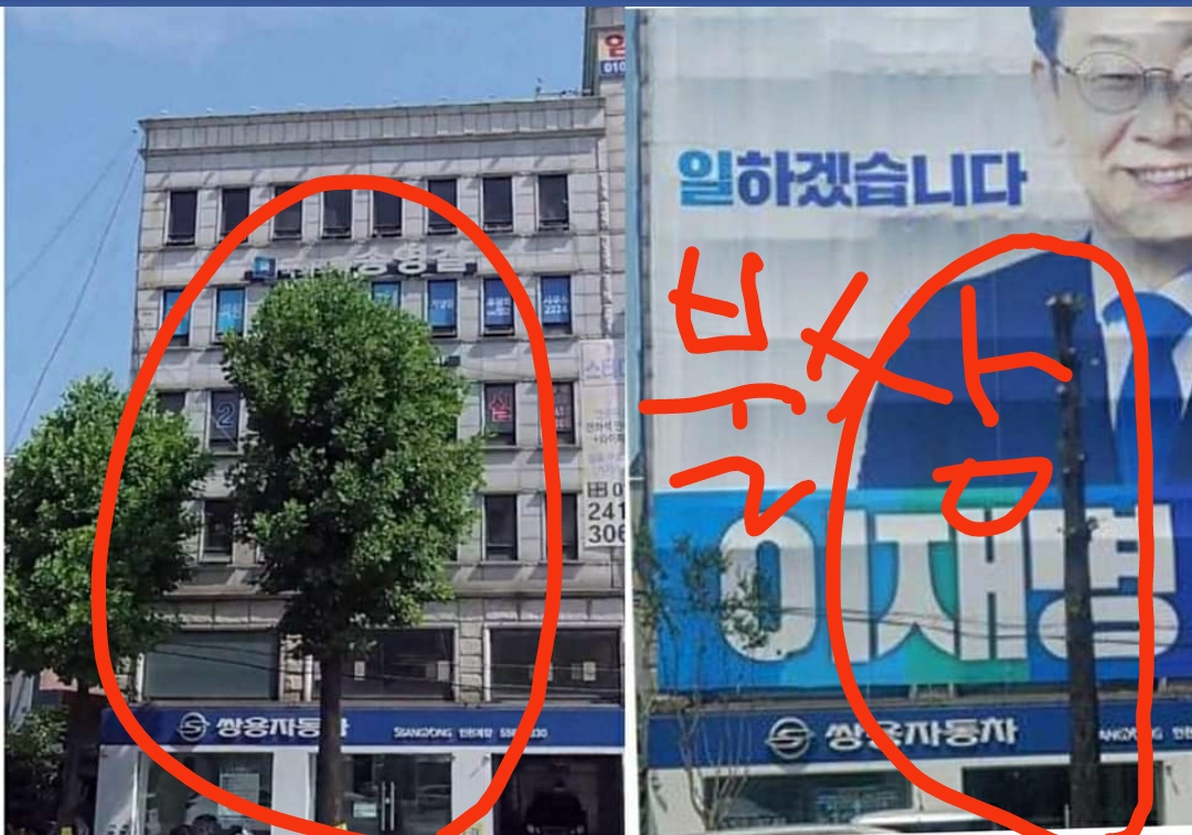 이재명이 합니다 라고 하니, 나무가 죽어나는 구나... 인천의 공기는 누가 책임져주나? 그리고, 저기서 제대로 숨 못쉬는 더불어민주당 이재명 선거사무실 인원들은 산소호흡기를 착용하고 선거운동해야할 수도 있을지 모르겠다.