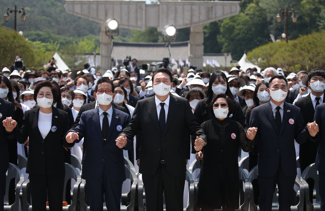윤 대통령의 이날 기념사는 이른바 ‘오월 정신’을 통한 국민 통합에 방점을 둔 것으로 해석된다. 대통령 본인이 전날까지 기념사를 직접 썼다 지우기를 반복하며 퇴고를 7차례 반복한 것으로 전해졌다. 대선 후보 시절 광주 시민들에게 손편지를 썼던 경험도 언급하며 “대한민국의 새로운 도약을 이뤄가는 여정에 광주, 호남이 앞장설 것”이라고도 했다. 윤 대통령은 이날 5·18 유족들과 함께 민주묘지 정문, 이른바 ‘민주의 문’을 통과해 입장했는데 보수 대통령으로는 역대 최초다. 윤 대통령을 비롯한 참석자들은 식순에 따라 ‘임을 위한 행진곡’도 제창했다.