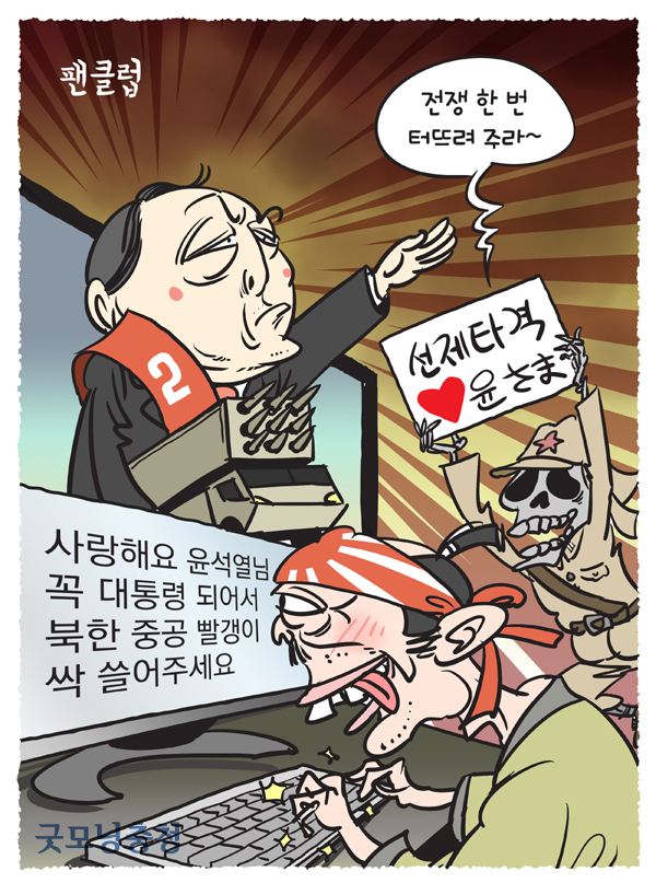한반도에서 전쟁이 일어날 경우 이득을 보는 쪽은 일본이라는 것은 기본상식에 가깝다. 도약의 힘을 잃어버리고 정체된 일본의 사회경제 시스템, 이들에게 '제 2의 한국전쟁'만큼 좋은 부활의 기회가 없다. 그래서일까? 일본 집권세력은 은근히 윤 후보의 승리를 기원하는 분위기다. '욘사마'의 미소는 일본에 한류열풍을 일으켰지만, '윤사마'의 반중정서는 잠재된 일본의 극우의식을 자극할까 우려스럽다.