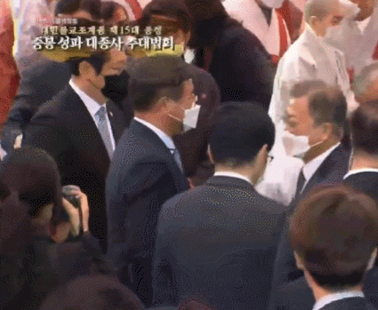 문재인 대통령이 이준석 국민의힘 대표와 인사를 나누는 모습. ‘BBS불교방송’ 유튜브 갈무리