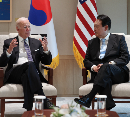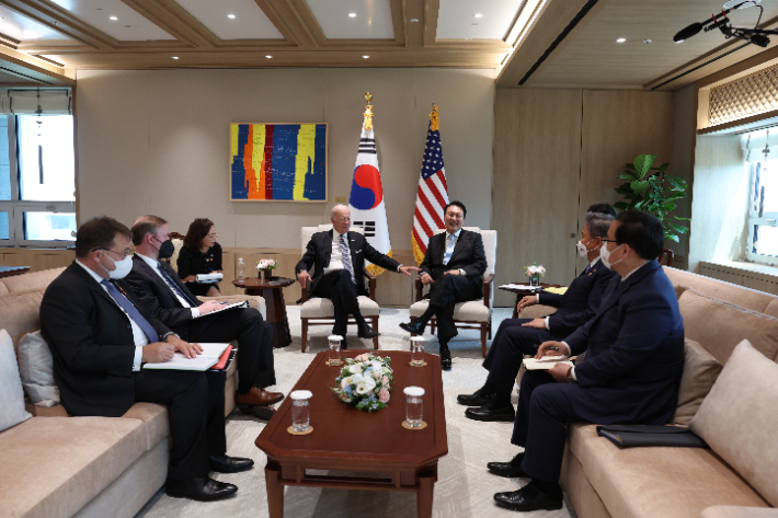 윤석열 대통령과 조 바이든 미국 대통령이 지난 21일 서울 용산 대통령실 청사 집무실에서 소인수 정상회담을 하고 있는 모습. 연합뉴스