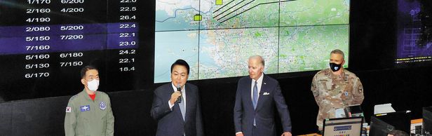 처음 공개된 오산 지하벙커… 北에 "도발 말라" 경고 - 윤석열(왼쪽에서 둘째) 대통령과 조 바이든(왼쪽에서 셋째) 미국 대통령이 22일 오후 경기 오산 미 공군기지의 항공우주작전본부(KAOC) 작전조정실에서 한미 양측 근무자들을 격려하고 있다. 윤 대통령은“이곳은 날로 고도화되는 북핵·미사일 위협에 한미가 공동으로 대응하는 핵심적인 장소이고 한미 동맹을 상징하는 곳”이라고 말했다. 바이든 대통령은“양국의 동맹은 오래전 (한국) 전쟁의 희생으로 맺어진 동맹”이라고 말했다. /연합뉴스