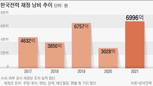 한전의 재정상 조치 금액은 매년 감사를 받아도 좀처럼 줄지 않고 있다. 작년의 경우 내부 감사로 6956억원, 외부 감사로 40억원 등 총 6996억원의 재정상 조치가 취해졌는데, 이는 최근 5년 새 최대 규모다. 회수할 수 없는 예산절감 금액만 보면 2017년 4113억원에서 작년 5389억원으로 31% 늘었다.