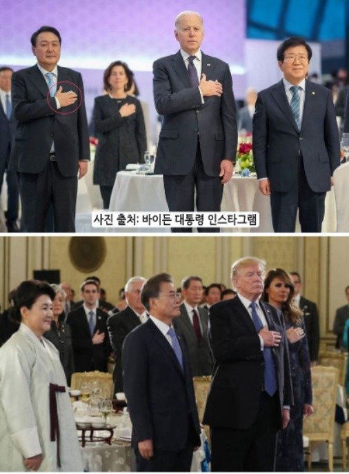 바이든 미국 대통령은 자신의 인스타그램에 윤 대통령과 함께 왼쪽 가슴에 손을 올린 사진을 실었다. 바이든 대통령 왼쪽에 자리한 박병석 국회의장은 차렷자세를 취한 상태였다.
