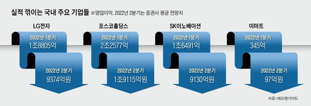 인플레로 인한 ‘소비의 후퇴’가 본격화하면서 유통업계 실적은 이미 꺾이고 있다. 대표적으로 이마트는 지난해 코로나 보복 소비로 호실적을 냈지만, 지난 4분기부터 매출은 정체되고 이익은 급감하고 있다. 지난해 3분기 1086억원이던 영업이익은 올 1분기 345억원으로 쪼그라들었다.
