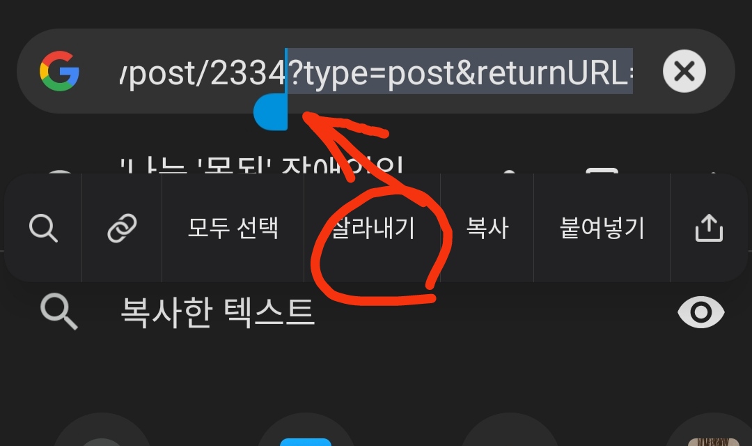 아래처럼 긴 주소를 선택해서 앞쪽으로 땡긴 뒤에 포스팅 주소의 끝까지만 살리려고 도전했다.