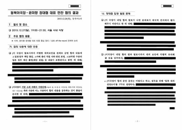 또 다른 문건들은 같은 해 3월 25일과 10월 27일, 위안부 합의 타결 전날인 12월 27일 저녁까지 이 전 외교부 동북아 국장이 윤 의원을 만나 협의했다고 기록하고 있다. 12월 27일 윤 의원과 이 전 국장의 만찬 협의 내용이 담긴 문건에는 ‘합의 내용에 대한 반응’이라는 소제목 하에 ‘(이 국장이 발표 시까지 각별한 대외보안을 전제로 금번 합의 내용에 일본 정부의 책임 통감, 아베 총리 직접 사죄·반성 표명, 10억엔 수준의 일본 정부 예산 출연(재단 설립) 등 내용이 포함된다고 밝힌 데 대해)’라는 내용이 담겼다.