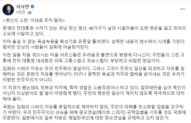 이낙연 더불어민주당 상임고문이 문재인 전 대통령 사저 앞 시위를 중단해 달라고 거듭 요청했다. 이 고문은 30일 “48가구가 살던 시골마을이 오랜 평안을 잃고 최악의 소요에 시달리고 있다”고 호소했다.