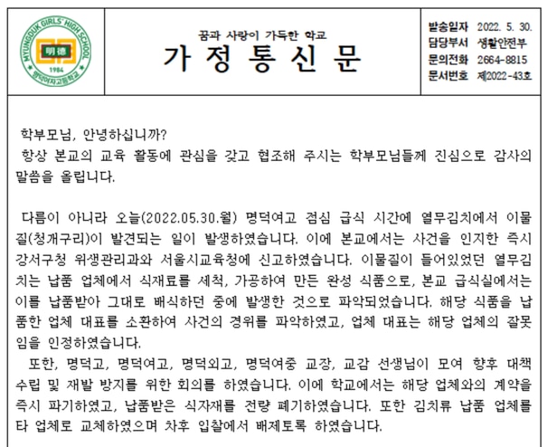 명덕여고 생활안전부는 이날 학부모들에게 보낸 ‘급식 이물질(청개구리) 발견에 따른 사과문’이라는 제목의 가정통신문에서 이런 사실을 알리고 “사건을 인지한 즉시 강서구청 위생관리과와 서울시교육청에 신고했다”고 밝혔다.