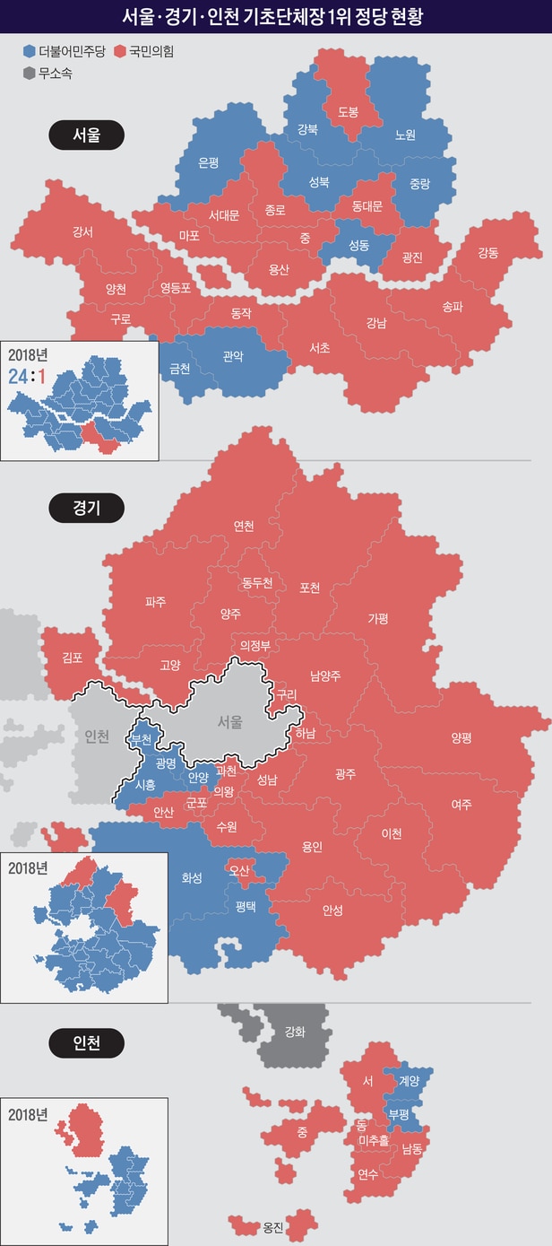 서울구청장 1대 24→17대 8 경기 기초단체장 2대 29→22대 9 [6·1 지방선거] 민심 뒤바뀐 수도권 국민의힘의 경기·인천 기초단체장 압승은 2006년 이후 16년 만