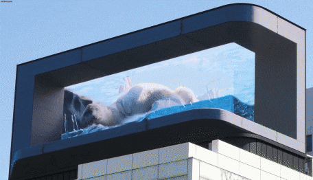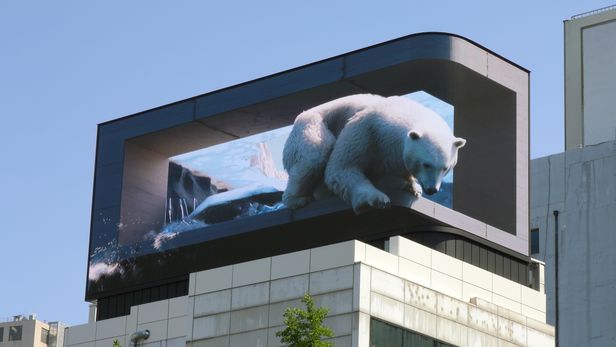 두 개 층 높이의 거대한 북극곰은 물에 빠져 허우적대다 포효하며 다시 물 위로 올라간다. 진짜 북극곰 같아 보이지만 198㎡에 달하는 대형 LED 스크린에 아나몰픽 기법으로 제작된 3D 북극곰 영상이다. 아나몰픽은 착시를 통해 입체효과를 나타내는 최신 영상제작 기법이다. 작년 도쿄 신주쿠 대형 전광판에 이 방식으로 제작된 실제와 같은 고양이가 재현돼 세계적으로 주목을 받은 바 있다.