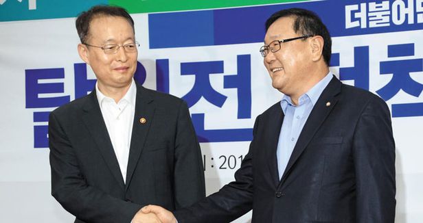 2017년 탈원전 당정회의 당시 백운규·김태년 - 지난 2017년 7월 31일 정부와 더불어민주당은 국회에서 탈원전 정책과 관련한 당정회의를 가졌다. 백운규(왼쪽) 당시 산업통상자원부 장관과 김태년(오른쪽) 정책위의장을 비롯, 홍익표 정책위 부의장, 이인호 산업부 차관 등이 참석했다. 양측은 공히 “전기 요금 인상은 없다”고 장담했지만, 정부 실무자들은“전기 요금 인상은 불가피하다”고 보고한 것으로 뒤늦게 밝혀졌다. /이덕훈 기자