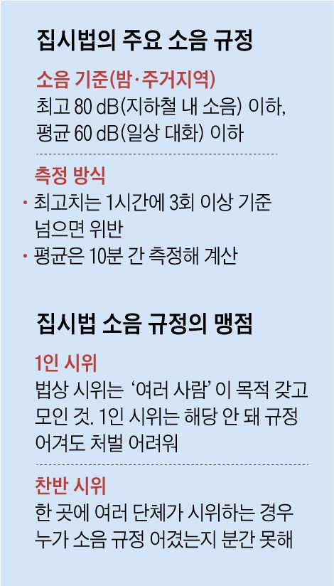 현행법은 집회나 시위가 열리는 장소에 따라 평균 소음 상한이 정해져 있다. 순간 최고 소음 한도도 있다. 예컨대 주거지 근처의 경우 낮 평균 65dB(데시벨)까지다. 사람들이 일상적인 대화를 할 때 발생하는 소음이 보통 60dB 정도다. 이 기준을 위반하면 6개월 이하의 징역 또는 50만원 이하의 벌금, 구류 등에 처해질 수 있다. 문제는 이런 규정을 피해가는 집회가 잇따르고 있다는 점이다.