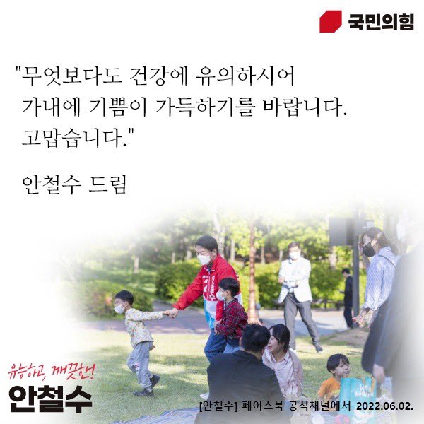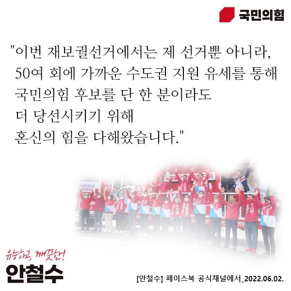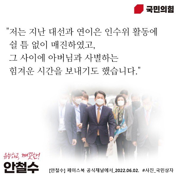 국민의힘 유능하고 깨끗한 "안철수입니다. 그동안 저를 응원해 주신 주민 여러분께 진심으로 감사를 드립니다." 아버님 사별 인수위 활동 재보궐선거 수도권 지원유세 혼신의 힘