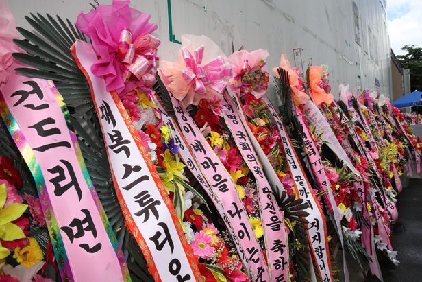 지난 6일 오전 서울 여의도 더불어민주당 중앙당사 들머리에 이재명 의원 지지자들이 보내온 화환들이 놓여있다. / 뉴스1