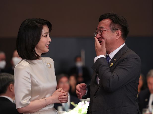 윤석열 대통령 부인 김건희 여사가 지난 10일 서울 중구 신라호텔 영빈관에서 열린 취임 기념 만찬에서 윤호중 더불어민주당 비상대책위원장과 대화하고 있다. /뉴스1