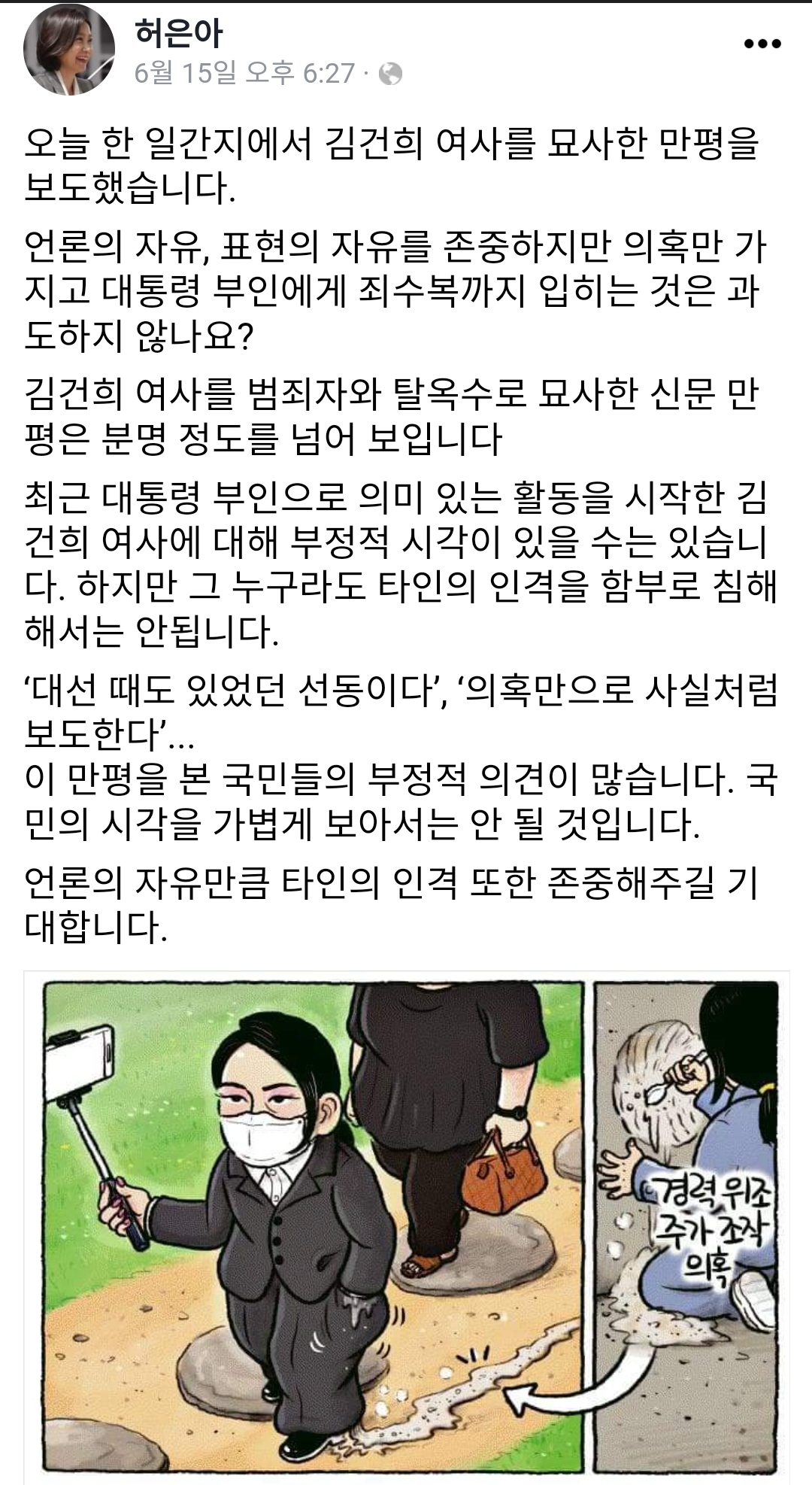 허은아 대통령 부인에 죄수복까지 입히는 건 만평 저격했다 만평 속 봉하마을 방문한 김 여사 옆 죄수복 입은 모습 허 대변인 만평을 본 국민들의 부정적 의견 많아 골수 진보 만평가?