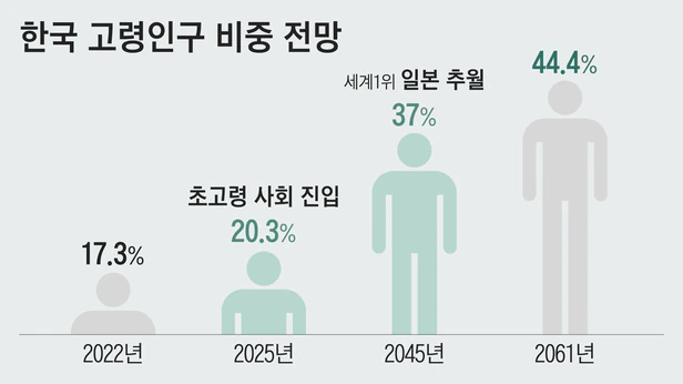 한국의 65세 이상 고령인구 비중은 2022년 기준 17.3%다. 2025년에는 20.3%로 미국(18.9%)을 제치고 초고령 사회에 진입하며, 2045년에는 37%로 세계 1위인 일본(36.8%)을 추월할 전망이다./자료=전경련