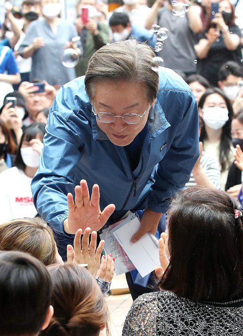 더불어민주당 이재명 의원이 18일 인천 계양구 계양산 야외공연장 앞에서 지지자들과 하이파이브를 하고 있다. 인천=뉴스1