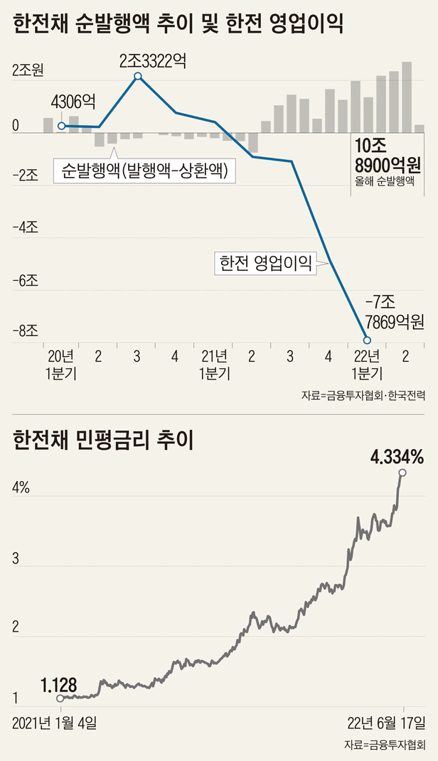 한전은 올해 매월 2조원이 넘는 채권을 순발행(발행액에서 상환액을 뺀 것)하고 있다. 각 증권사는 입찰을 통해 물량을 받아와 팔고 있는데, 2000억원어치가 순식간에 팔려나갈 정도로 인기를 끌고 있다. 여의도에서는 “한은이 물가상승률을 낮추기 위해 금리를 올리면서 시중 유동성을 빨아당기려고 애쓰고 있는데, 한전이 지금 그 역할을 하고 있다”며 “한은 위에 한전”이라는 말까지 나올 정도다.
