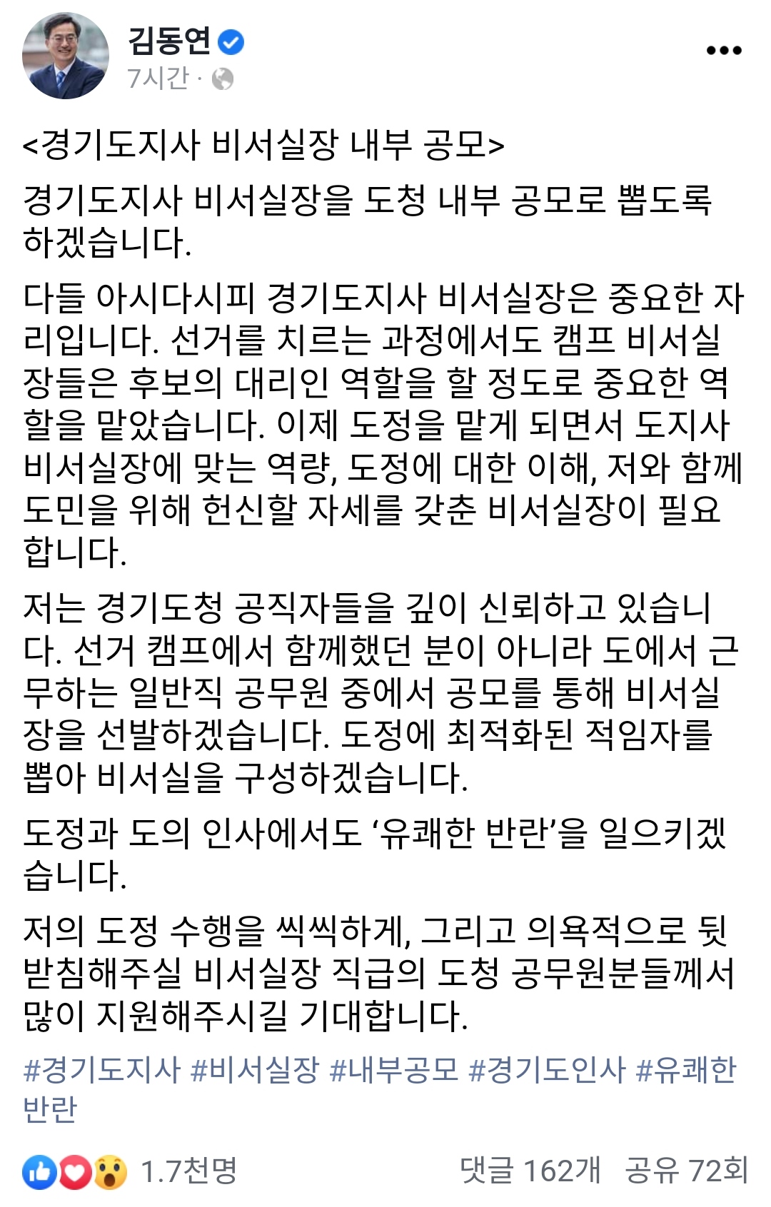 또 “경기도청 공직자들을 깊이 신뢰하고 있다. 선거 캠프에서 함께했던 분이 아니라 도에서 근무하는 일반직 공무원 중에서 공모를 통해 비서실장을 선발하겠다. 도정에 최적화된 적임자를 뽑아 비서실을 구성하겠다”고 밝혔다. 또 “도정과 도의 인사에서도 ‘유쾌한 반란’을 일으키겠다”고 덧붙였다.