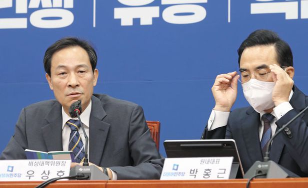 野 "월북으로 조작할 동기 없다" - 더불어민주당 우상호(왼쪽) 비상대책위원장이 20일 국회에서 열린 비상대책위원회의에서 발언하고 있다. 우 위원장은 이날“저분들(윤 정부)은‘그 당시 월북으로 조작했다’고 주장하고 싶은 건데, 문재인 정부가 월북으로 조작할 동기가 어디 있느냐”고 했다. /국회사진기자단