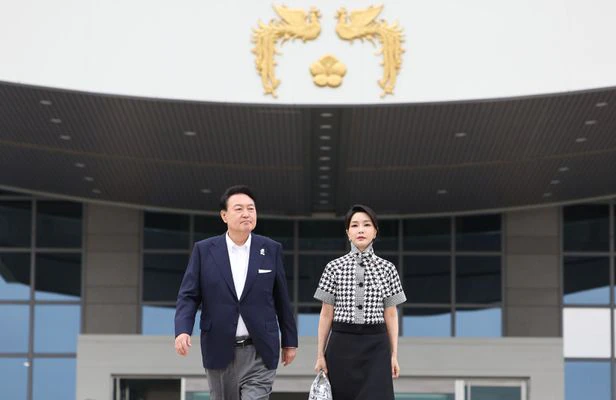 윤석열 대통령과 부인 김건희 여사가 지난 12일 오후 용산 대통령실에서 열린 제75회 칸 국제영화제 남우주연상·감독상 수상기념 영화 관계자 초청 리셉션 및 만찬에 참석하고 있다. /대통령실 제공