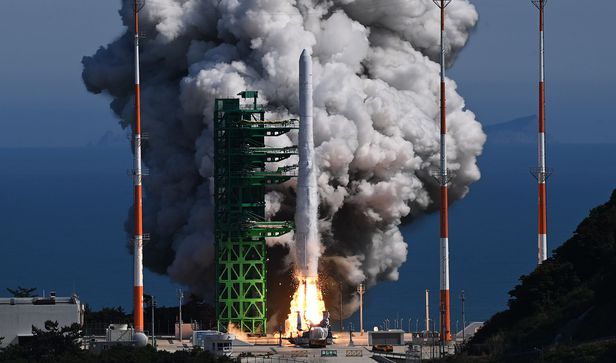 순수 국내 기술로 설계 및 제작된 한국형 발사체 누리호(KSLV-Ⅱ)가 21일 전남 고흥군 나로우주센터 발사대에서 화염을 내뿜으며 우주로 날아오르고 있다. 실제 기능이 없는 모사체(더미) 위성만 실렸던 1차 발사와 달리 이번 2차 발사 누리호에는 성능검증위성과 4기의 큐브위성이 탑재됐다. /2022.06.21 사진공동취재단
