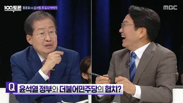 23일 방송된 ‘100분 토론’에는 국민의힘 소속 홍 당선인과 더불어민주당 소속 강기정 광주시장 당선인이 출연했다. 이들은 정치 현안에 대해 열띤 토론을 펼쳤다. 이날 방송의 하이라이트는 홍 당선인이었다. 홍 당선인은 자신이 소속된 국민의힘을 거침없이 비판하는가 하면, 민주당을 향해 사이다 발언을 날렸다.