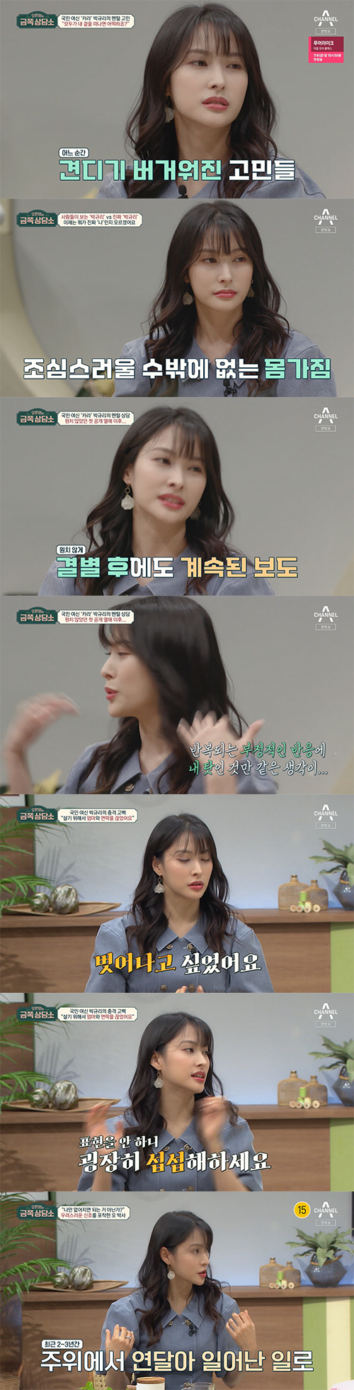 박규리는 "제가 선택해서 만났는데 원치 않게 기사가 많이 났다. 또 좋은 이슈보다는 안 좋은 이슈로 기사가 많이 났다. 모든 기사의 중심에 제가 프레임이 씌워지더라. 제가 가만히 있어도 욕을 먹고 있었다. 저도 사람이라 왜 이렇게까지 나쁘게 얘기하지라고 생각했다. 어떤 순간순간이 내탓이 되는 순간이 오더라"라고 담담하게 이야기했다.