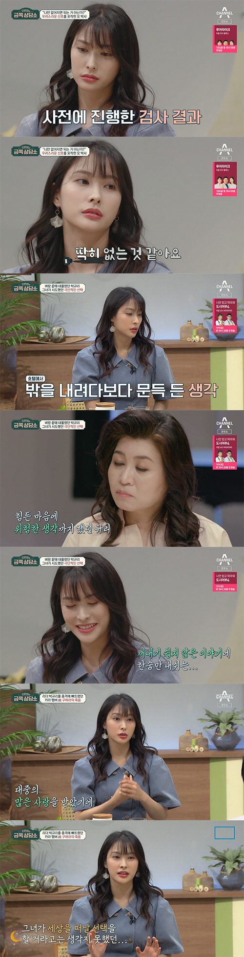 박규리른 "아픈 건 싫으니까. 약을 모은 적이 있었다. 혼자 여행을 갔는데 날씨도 스산하고 그렇더라. 밖을 내려다보는데 너무 높아서 아무 생각이 없겠다라고 생각했었다"라며 "멤버가 떠났다. 그 때 제가치관이 완전 무너졌다. 그렇게 예쁜 사람이 떠날 거라고 생각을 해보지 않았다"라며 세상을 떠난 故 구하라를 떠올렸다.