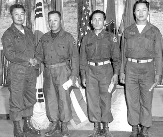 제5사단장으로 부임한 박정희의 보직신고를 받는 백선엽