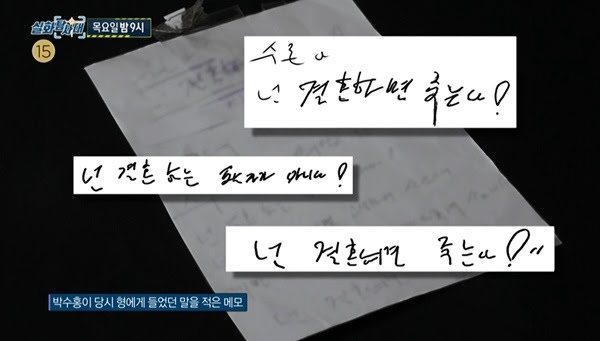 '실화탐사대'가 공개한, 박수홍이 당시 형에게 들었던 말을 적은 메모에는 '넌 결혼하면 죽는다', '넌 결혼할 팔자가 아니다' 등의 이야기가 담겨 있다.
