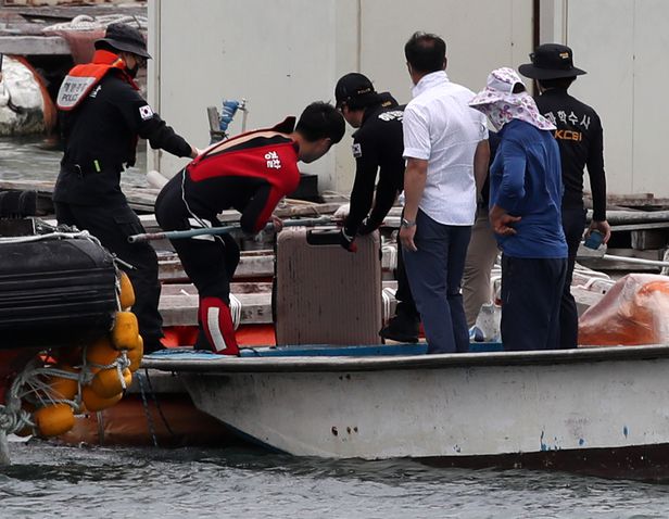 28일 오후 전남 완도군 신지면 송곡선착장 방파제로부터 80m 지점 가두리 양식장 아래에서 실종된 조유나(10) 양 가족의 차량으로 추정되는 아우디 승용차가 발견됐다. 경찰이 수중에 있는 차량 내에서 케리어를 건져 올리고 있다. 2022.6.28 /연합뉴스