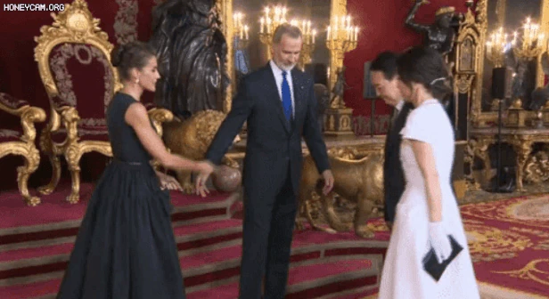김건희 촬영 머뭇거리자 스페인 국왕부부 동시에 이쪽으로 윤석열 대통령과 김건희 여사가 스페인 마드리드 왕궁에서 열린 펠리페 6세 스페인 국왕 내외와 기념촬영