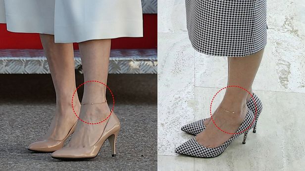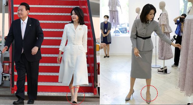27일(현지시각) 북대서양조약기구(나토) 정상회의 참석을 위해 스페인 마드리드 바라하스 국제공항에 윤석열대통령과 김건희여사(왼쪽)가 도착한 가운데 김여사의 왼쪽 발목에 착용한 발찌가 눈길을 끌었다.일정 첫날인 28일(현지시각) 김여사의 단독 일정으로 마드리드에 있는 한국문화원을 방문한 길에도 왼발에 발찌를 착용한 모습이 보였다./연합뉴스