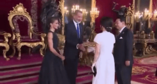 28일(현지시간) 펠리페 6세 스페인 국왕 부부와 만난 김건희 여사. 손을 흔들흔들했고 기념 촬영을 위해 국왕 왼편으로 가야 했지만 뒤로 주춤해 국왕 부부가 자리를 안내했다. NATO 공식 계정 캡처