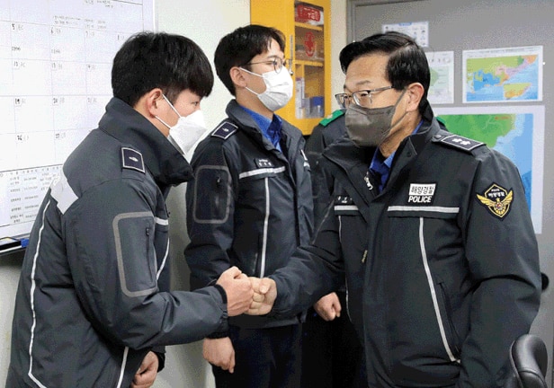 윤성현 남해지방해양경찰청장(오른쪽)이 2022년 임인년 첫날인 1월 1일 부산 수영구 광안리해양파출소를 방문, 직원·의무경찰 등과 인사하고 있다. photo 뉴시스